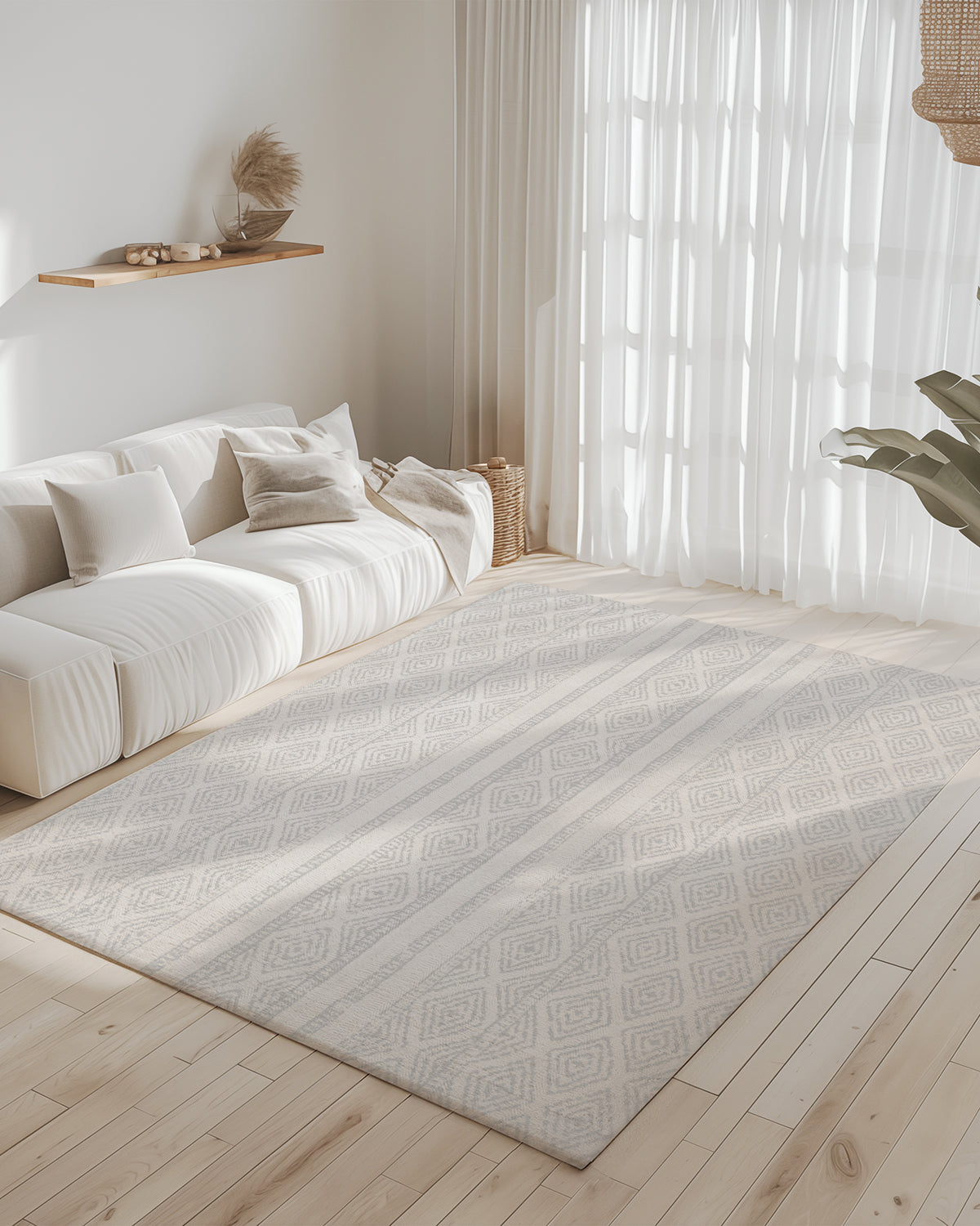 Lado B: por el otro lado, este play mat presenta un patrón geométrico de líneas y rombos en tonos grises, ideal para un ambiente moderno y minimalista. Su diseño limpio y versátil lo hace perfecto para espacios donde se busca un estilo contemporáneo sin renunciar al confort.